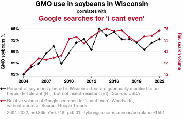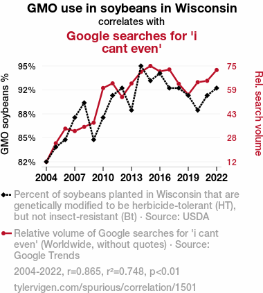 This means 74.8% of the change in the one variable (i.e., Google searches for 'i cant even') is predictable based on the change in the other (i.e., GMO use in soybeans in Wisconsin) over the 19 years from 2004 through 2022.