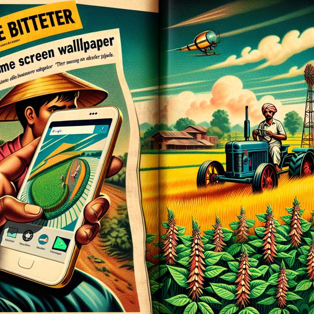 ChatGPT: In a bustling cotton field, a farmer is using a smartphone to search "desktop background" on Google while a tractor with a "GMO Cotton" sign works in the background.