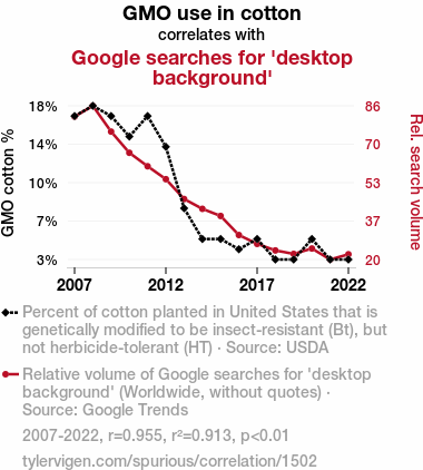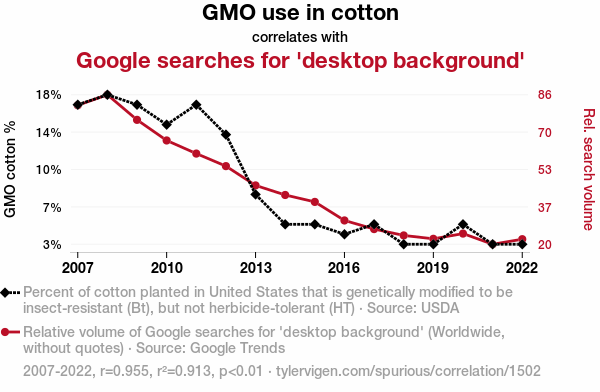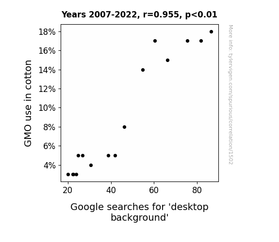 - The spurious research paper: Cotton GMO Grow, Desktop Background Glow: A Rhyme-y Study of Google Trends and Agricultural Prose