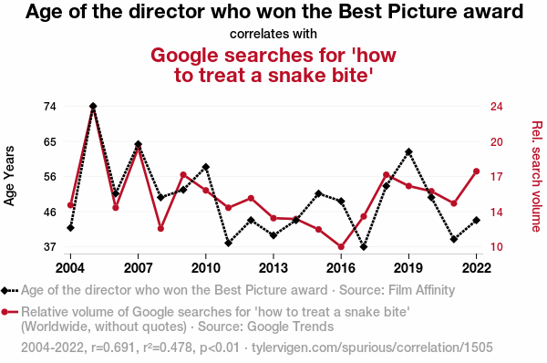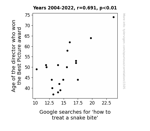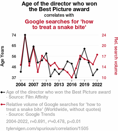 - The spurious research paper: Director's Age: A Snake Bite or a Bait? A Correlational Analysis of Best Picture Winners and Google Searches for Snake Bite Treatment