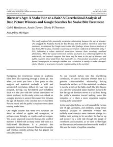Director's Age: A Snake Bite or a Bait? A Correlational Analysis of Best Picture Winners and Google Searches for Snake Bite Treatment The Journal of Cinematic Epidemiology Jan 2024 Reminder: This paper is AI-generated. Not real! |