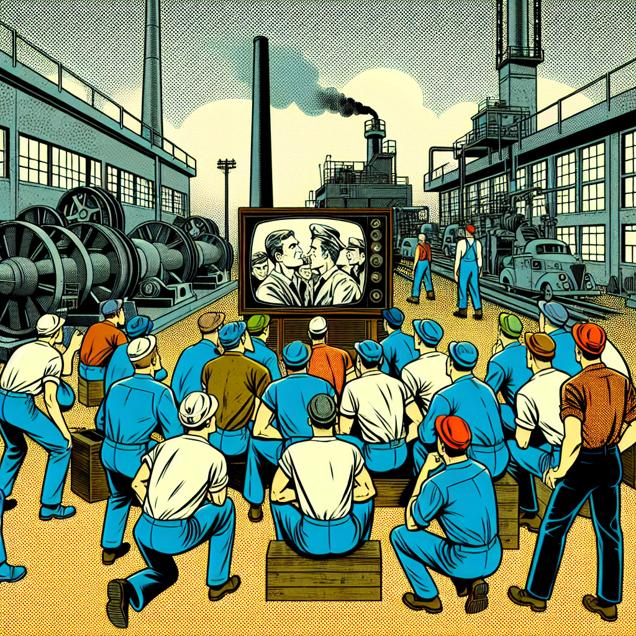 Prompt: [ A comic-book-style illustration with muted colors and a dotted halftone pattern from the 1960s ] Generate an image of a bustling city in North Dakota, where a group of enthusiastic millwrights is gathered around a television screen. The image should capture the lively energy of the group as they watch one of Sylvester Stallone's action-packed films. As the number of films in Stallone's filmography increases, the group's determination and unity should become more pronounced. They should be inspired by Stallone's grit and resilience, and it should be evident that they are channeling that spirit into their work as they strive to be the "Rocky Balboa of millwrights" while maintaining and repairing mills across the state. The visual depiction should be simple, avoiding any words or speech bubbles. The depiction should include only scenes, people, and objects, it should not include text or speech bubbles.