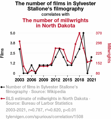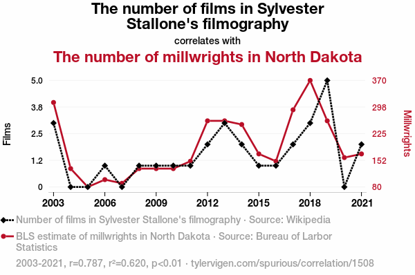 Sylvester Stallone filmography, millwrights in North Dakota, correlation, surprising linkage, statistical significance, Wikipedia, Bureau of Labor Statistics, correlation coefficient, p-value, skilled trade workforce, macho persona, Midwest labor demographics