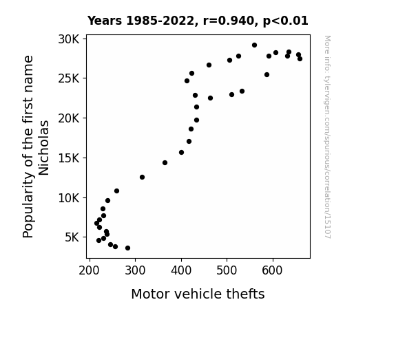 This means 88.4% of the change in the one variable (i.e., Motor vehicle thefts) is predictable based on the change in the other (i.e., Popularity of the first name Nicholas) over the 38 years from 1985 through 2022.