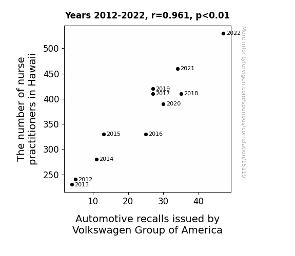 This means 92.3% of the change in the one variable (i.e., Automotive recalls issued by Volkswagen Group of America) is predictable based on the change in the other (i.e., The number of nurse practitioners in Hawaii) over the 11 years from 2012 through 2022.