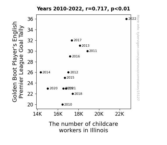 This means 51.4% of the change in the one variable (i.e., The number of childcare workers in Illinois) is predictable based on the change in the other (i.e., Golden Boot Player's English Premier League Goal Tally) over the 13 years from 2010 through 2022.