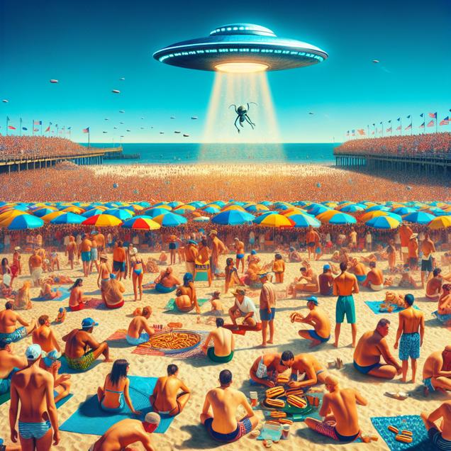 ChatGPT: In Coney Island, New York, a crowd gathers to watch the annual Nathan's Hot Dog Eating Competition. As spectators cheer on the champions, a mysterious UFO hovers in the bright blue sky, catching the attention of both the crowd and the competitors.
