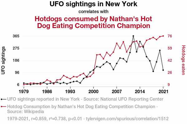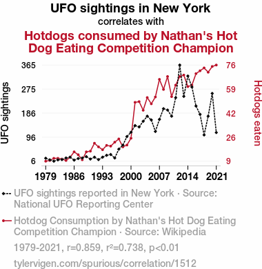 - The spurious research paper: Unidentified Food Objects: Exploring the Link Between UFO Sightings in New York and Hotdogs Consumed by Nathan's Hot Dog Eating Competition Champion