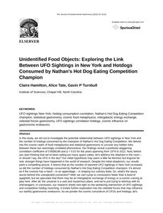 User prompt: Please provide potential search keywords for a paper titled Unidentified Food Objects: Exploring the Link Between UFO Sightings in New York and Hotdogs Consumed by Nathan's Hot Dog Eating Competition Champion with an abstract of In this study, we set out to investigate the potential relationship between UFO sightings in New York and the number of hotdogs consumed by the champion of Nathan's Hot Dog Eating Competition. We delved into the cosmic realm of food metaphysics and statistical gastronomy to uncover any hidden links between these two seemingly unrelated phenomena. Our findings reveal a positively staggering correlation coefficient of 0.8588186 and p < 0.01 for the years spanning from 1979 to 2021.