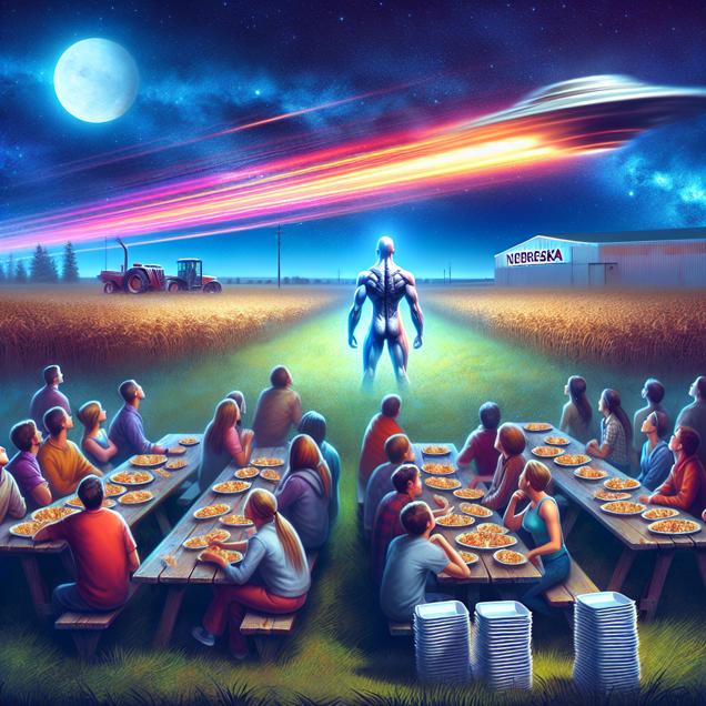 ChatGPT: In a vast Nebraska field, a group of people gathered to watch the night sky. Suddenly, a bright light streaked across the horizon, as a UFO zoomed overhead. Meanwhile, on the sidelines, the champion of Nathan's Hot Dog Eating Competition stood surrounded by empty hot dog trays, having consumed a record-breaking number of hot dogs.