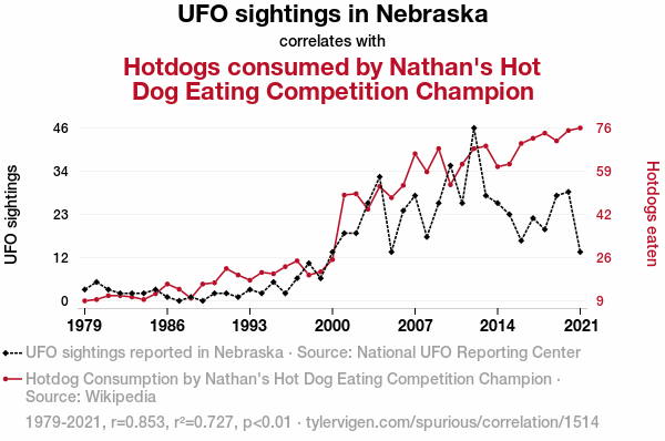"UFO sightings Nebraska", "Nathan's Hot Dog Eating Competition", "extraterrestrial visitations and food consumption", "National UFO Reporting Center data", "correlation between UFO sightings and hotdog consumption", "cosmic culinary preferences", "intergalactic visitors impact on food consumption", "statistical analysis on cosmic coincidences", "UFO sightings correlation coefficient"