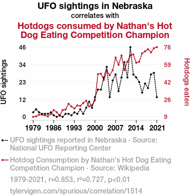 This means 72.7% of the change in the one variable (i.e., Hotdogs consumed by Nathan's Hot Dog Eating Competition Champion) is predictable based on the change in the other (i.e., UFO sightings in Nebraska) over the 43 years from 1979 through 2021.