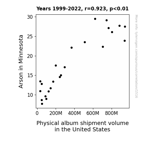 - The spurious research paper: Playing with Fire: The Dire Link Between Arson in Minnesota and Physical Album Shipment Volume in the United States