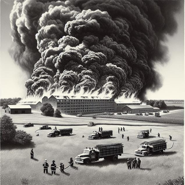 Prompt: Generating Prompt: [A black-and-white newspaper illustration] Create an image of a grassy field in Minnesota, where a warehouse is engulfed in flames, billowing thick smoke into the clear blue sky. Firefighters are seen battling the intense fire, while in the distance, a convoy of trucks loaded with physical albums is making its way to different parts of the United States. Keep the visual composition simple and focus on capturing the dramatic contrast between the fire and the calm surroundings. The depiction should include only scenes, people, and objects, it should not include text or speech bubbles.