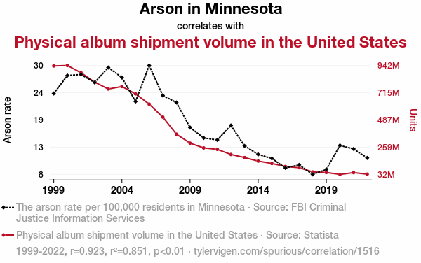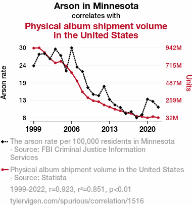 - The spurious research paper: Playing with Fire: The Dire Link Between Arson in Minnesota and Physical Album Shipment Volume in the United States