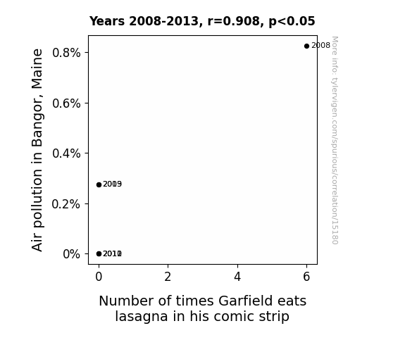 This means 82.5% of the change in the one variable (i.e., Number of times Garfield eats lasagna in his comic strip) is predictable based on the change in the other (i.e., Air pollution in Bangor, Maine) over the 6 years from 2008 through 2013.