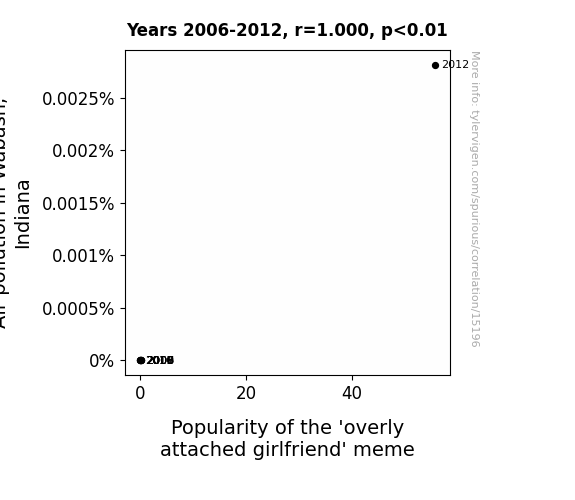 This means 100% of the change in the one variable (i.e., Popularity of the 'overly attached girlfriend' meme) is predictable based on the change in the other (i.e., Air pollution in Wabash, Indiana) over the 7 years from 2006 through 2012.
