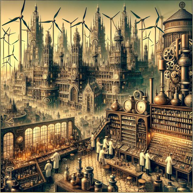 ChatGPT: Generate an image of a sprawling steampunk cityscape, with towering wind turbines integrated seamlessly into the architecture. The city should have an industrial, Victorian-era feel, with gears, pipes, and steam-powered machinery. In the foreground, show a group of dedicated pharmacists working in a vintage apothecary, surrounded by antique medicine bottles and elaborate steampunk equipment. The scene should exude an atmosphere of innovation, community care, and the harmonious coexistence of advanced technology and traditional craftsmanship.