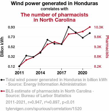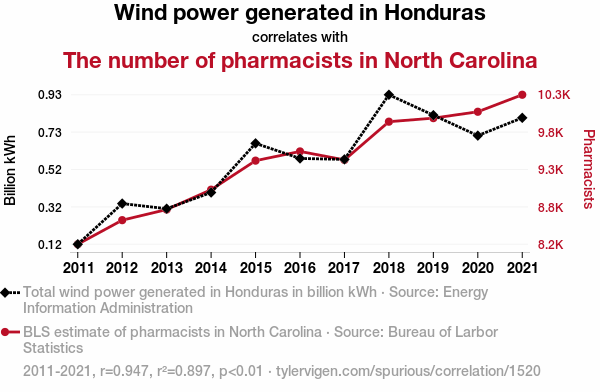 This means 89.7% of the change in the one variable (i.e., The number of pharmacists in North Carolina) is predictable based on the change in the other (i.e., Wind power generated in Honduras) over the 11 years from 2011 through 2021.