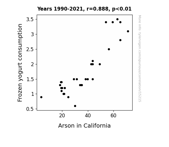 This means 78.9% of the change in the one variable (i.e., Arson in California) is predictable based on the change in the other (i.e., Frozen yogurt consumption) over the 32 years from 1990 through 2021.