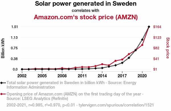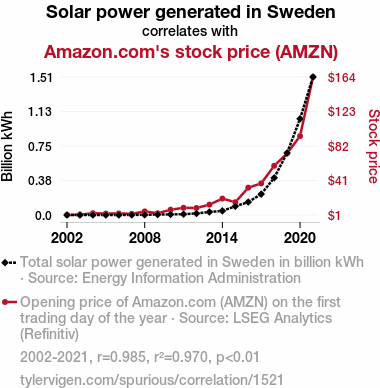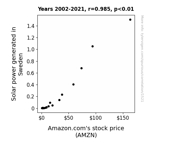This means 97% of the change in the one variable (i.e., Amazon.com's stock price (AMZN)) is predictable based on the change in the other (i.e., Solar power generated in Sweden) over the 20 years from 2002 through 2021.