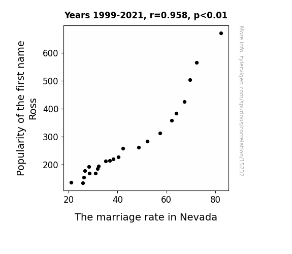This means 91.8% of the change in the one variable (i.e., The marriage rate in Nevada) is predictable based on the change in the other (i.e., Popularity of the first name Ross) over the 23 years from 1999 through 2021.