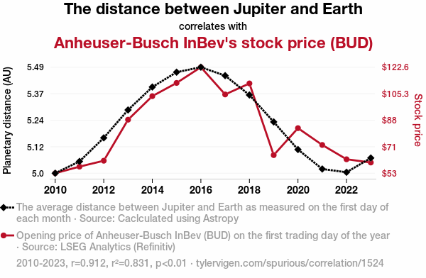 User prompt: Please provide potential search keywords for a paper titled Brewing Something Celestial: The Interstellar Influence on Beer Stocks with an abstract of This paper explores the peculiar connection between the distance between Jupiter and Earth and the stock price of Anheuser-Busch InBev (BUD). Utilizing data from Astropy and LSEG Analytics (Refinitiv), we conducted a comprehensive analysis covering the period from 2010 to 2023. Our findings reveal a striking correlation coefficient of 0.9117331 and p < 0.01, indicating a robust statistical relationship between the celestial distance and the brewery's financial performance. We delve into the implications of this cosmic correlation, shedding light on the astrological influence on earthly investments. Join us in raising a glass to the unexpected celestial factors shaping the market trends in the brewing industry.
