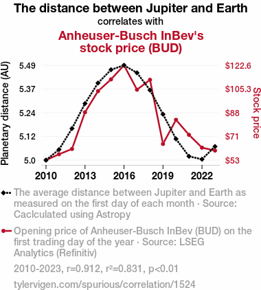 This paper explores the peculiar connection between the distance between Jupiter and Earth and the stock price of Anheuser-Busch InBev (BUD). Utilizing data from Astropy and LSEG Analytics (Refinitiv), we conducted a comprehensive analysis covering the period from 2010 to 2023. Our findings reveal a striking correlation coefficient of 0.9117331 and p < 0.01, indicating a robust statistical relationship between the celestial distance and the brewery's financial performance. We delve into the implications of this cosmic correlation, shedding light on the astrological influence on earthly investments. Join us in raising a glass to the unexpected celestial factors shaping the market trends in the brewing industry.