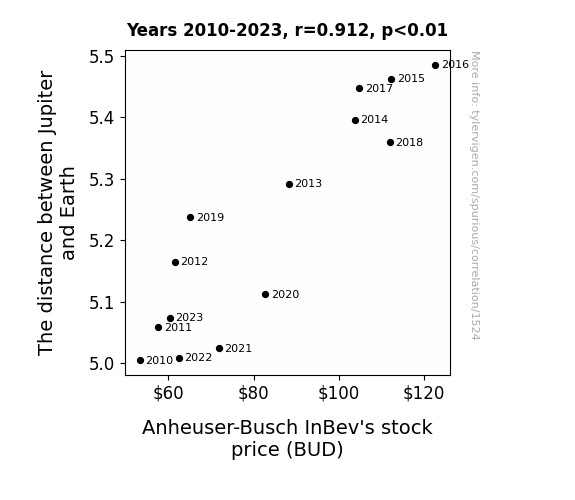 This means 83.1% of the change in the one variable (i.e., Anheuser-Busch InBev's stock price (BUD)) is predictable based on the change in the other (i.e., The distance between Jupiter and Earth) over the 14 years from 2010 through 2023.