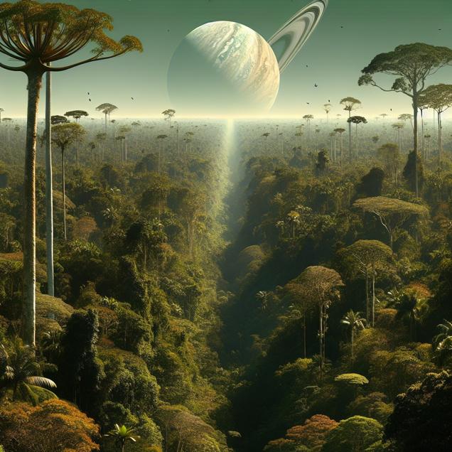 ChatGPT: Generate an image that encapsulates the vast expanse of the Brazilian Amazon, with towering trees reaching towards the sky, creating a lush and dense forest canopy. In the distant background, capture the tiny, remote planet of Mercury as a mere speck, with the distant presence of Neptune emphasizing the vast scale of our solar system. Let the richness of the Amazon and the insignificance of the planets against its grandeur be the focal point.