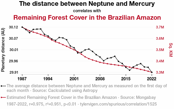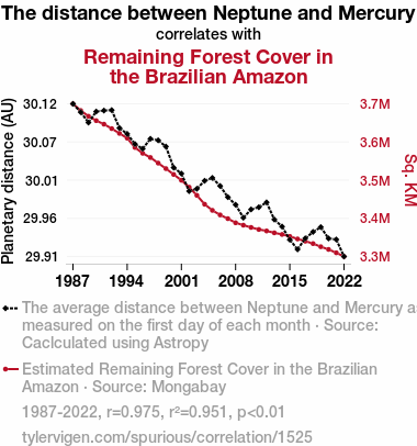 This means 95.1% of the change in the one variable (i.e., Remaining Forest Cover in the Brazilian Amazon) is predictable based on the change in the other (i.e., The distance between Neptune and Mercury) over the 36 years from 1987 through 2022.