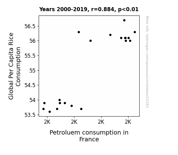 This means 78.1% of the change in the one variable (i.e., Petroluem consumption in France) is predictable based on the change in the other (i.e., Global Per Capita Rice Consumption) over the 20 years from 2000 through 2019.