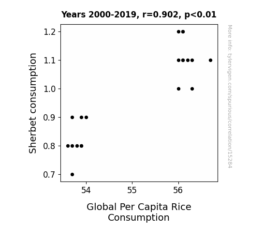 This means 81.3% of the change in the one variable (i.e., Global Per Capita Rice Consumption) is predictable based on the change in the other (i.e., Sherbet consumption) over the 20 years from 2000 through 2019.