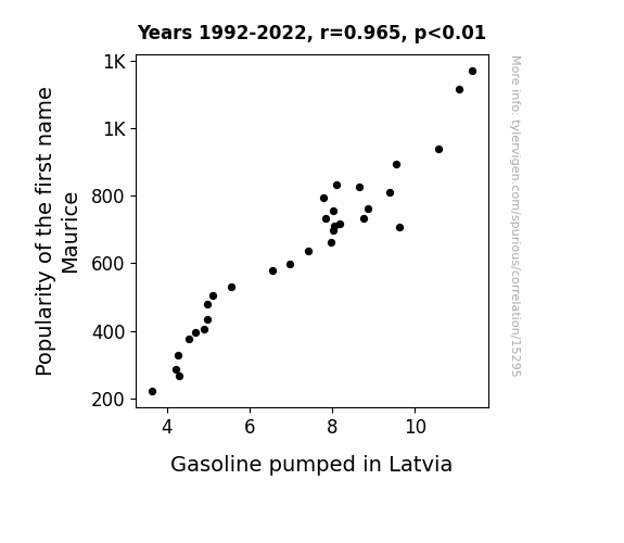 This means 93.1% of the change in the one variable (i.e., Gasoline pumped in Latvia) is predictable based on the change in the other (i.e., Popularity of the first name Maurice) over the 31 years from 1992 through 2022.