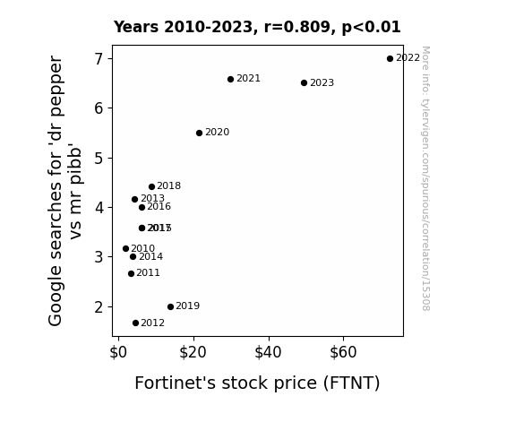 This means 65.4% of the change in the one variable (i.e., Fortinet's stock price (FTNT)) is predictable based on the change in the other (i.e., Google searches for 'dr pepper vs mr pibb') over the 14 years from 2010 through 2023.