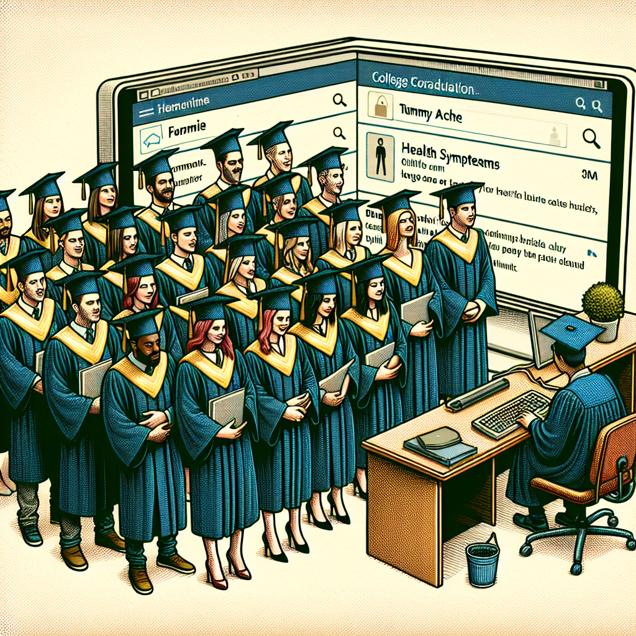 Prompt: Generate an image in the style of a TIME magazine cover that shows a college graduation ceremony. In the foreground, there are students in graduation gowns and caps receiving their Associates degrees in Liberal Arts. In the background, there is a group of people huddled around a computer, conducting Google searches for "tummy ache." The setting should be simple and focused on capturing the essence of the scene. The depiction should include only scenes, people, and objects, it should not include text or speech bubbles.