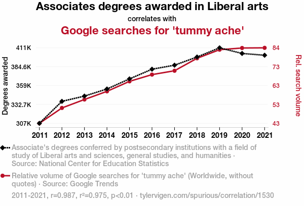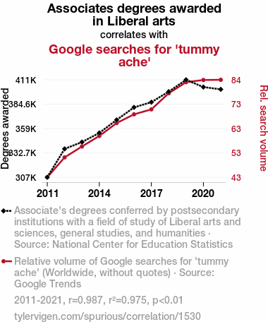 Associates degrees, Liberal Arts, Google searches, 'tummy ache', correlation, National Center for Education Statistics, Google Trends, correlation coefficient, stomach discomfort, remedies