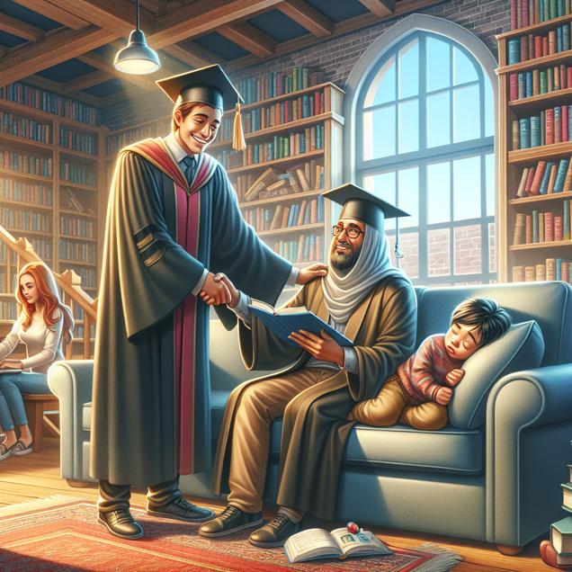 Prompt: [ A photo-realistic image ] In a cozy library, a smiling graduate in a cap and gown receives an Associates degree in Multi/interdisciplinary studies from a professor. Nearby, a concerned parent sits in an armchair using a laptop to search "tummy ache" on Google, as their child rests their head on their lap. The library shelves are filled with books, and warm sunlight streams in through the windows, creating a comforting atmosphere. The depiction should include only scenes, people, and objects, it should not include text or speech bubbles.