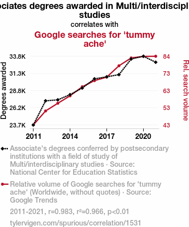 - The spurious research paper: The Belly of the Beast: An Examination of the Association Between Associates Degrees in Multi/Interdisciplinary Studies and Google Searches for 'Tummy Ache'