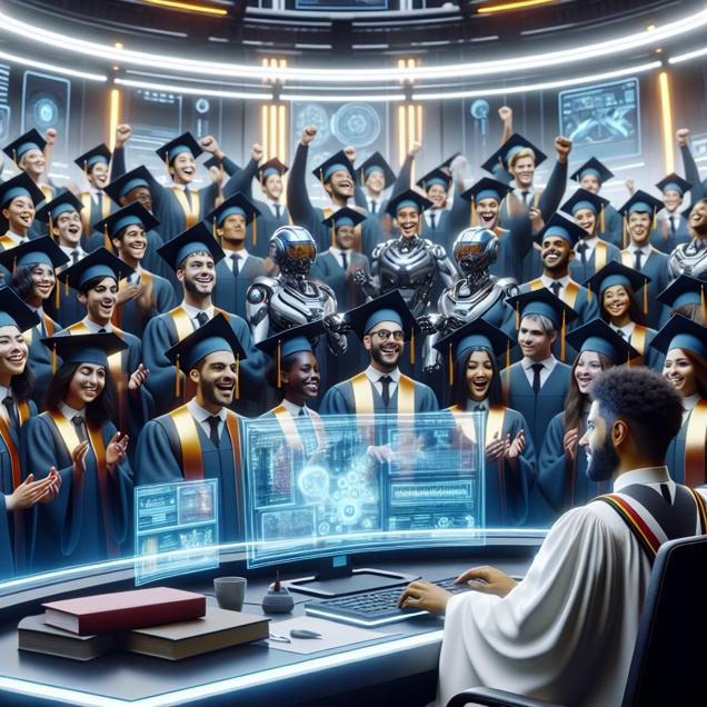 ChatGPT: Generate an image of a futuristic graduation ceremony showcasing jubilant students in sleek, high-tech graduation gowns. The graduates are receiving Bachelor's degrees in Military Technologies and Applied Sciences. In the background, a determined individual is depicted sitting in front of a futuristic computer, typing "how to move to Europe" into the Google search bar. Capture the high-tech atmosphere with modern, sophisticated elements while illustrating the contrast between the celebration and the focused person seeking information about relocating to Europe.
