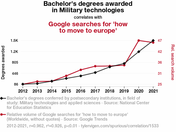 - The spurious research paper: Marching to a Different Beat: The Syncopated Rhythm of Bachelor's Degrees in Military Technologies and Applied Sciences and Google Searches for 'How to Move to Europe'