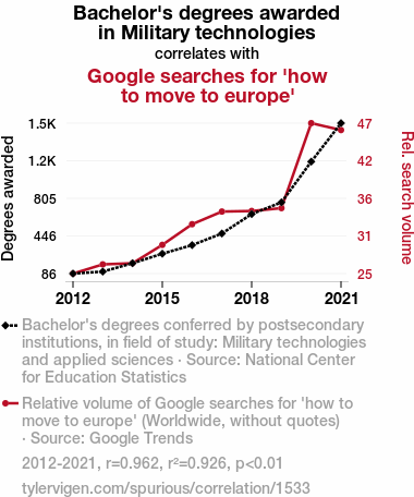 User prompt: Please make up a funny explanation for how an increase in Bachelor's degrees awarded in Military technologies and applied sciences caused how to move to europe (Google searches for 'how to move to europe') to increase. Make it feel plausible.