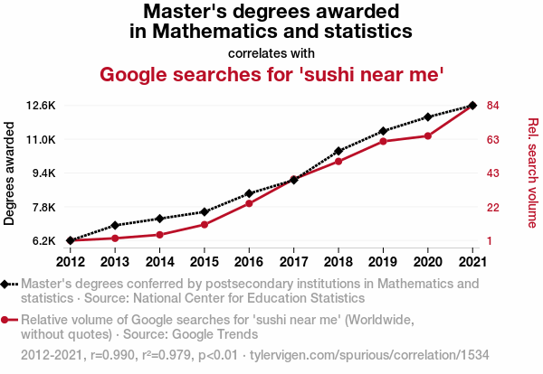 This means 97.9% of the change in the one variable (i.e., Google searches for 'sushi near me') is predictable based on the change in the other (i.e., Master's degrees awarded in Mathematics and statistics) over the 10 years from 2012 through 2021.