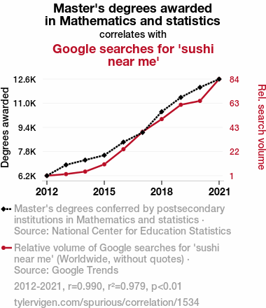 - The spurious research paper: Rolling in the Data: Uncovering the Relationship Between Master's Degrees in Mathematics and Sushi Searches