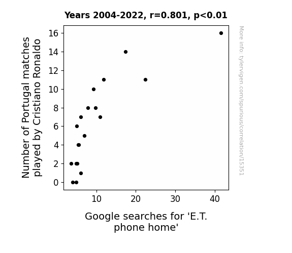 This means 64.1% of the change in the one variable (i.e., Google searches for 'E.T. phone home') is predictable based on the change in the other (i.e., Number of Portugal matches played by Cristiano Ronaldo) over the 19 years from 2004 through 2022.