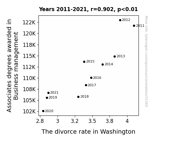 This means 81.3% of the change in the one variable (i.e., The divorce rate in Washington) is predictable based on the change in the other (i.e., Associates degrees awarded in Business management) over the 11 years from 2011 through 2021.