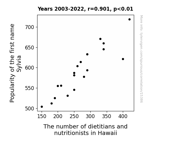 This means 81.2% of the change in the one variable (i.e., The number of dietitians and nutritionists in Hawaii) is predictable based on the change in the other (i.e., Popularity of the first name Sylvia) over the 20 years from 2003 through 2022.