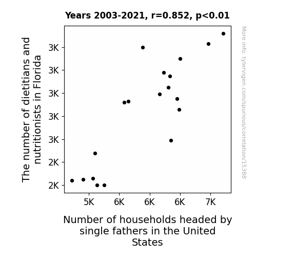 This means 72.6% of the change in the one variable (i.e., Number of households headed by single fathers in the United States) is predictable based on the change in the other (i.e., The number of dietitians and nutritionists in Florida) over the 19 years from 2003 through 2021.