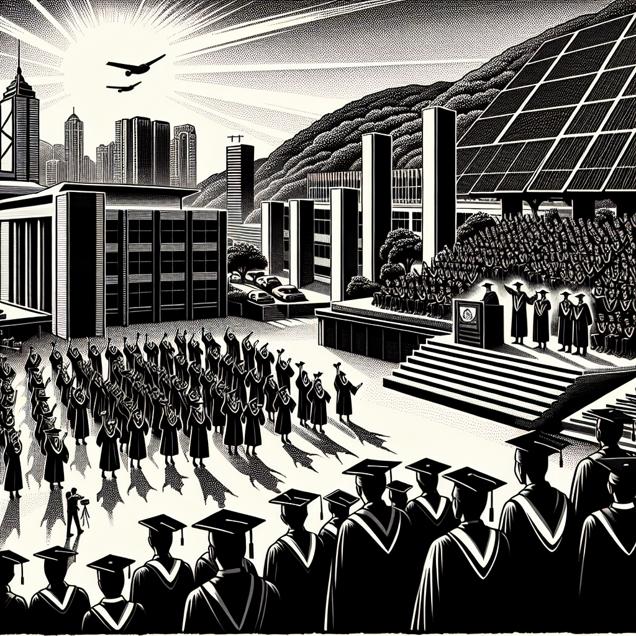 ChatGPT: Create an image in the style of a black-and-white newspaper illustration of a university graduation ceremony in Hong Kong. In the scene, graduates proudly receive their Master's degrees in Military technologies while the bright sun shines above them. Nearby, solar panels glisten with the energy they are generating, powering buildings and streetlights. Ensure that the graduation ceremony and the solar panels are clearly depicted in the illustration, paying attention to the contrast between light and shadow in the black-and-white style.