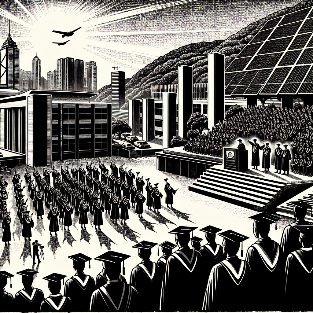 ChatGPT: In Hong Kong, a university graduation ceremony takes place under the bright sun. Graduates proudly receive their Master's degrees in Military technologies, while nearby, solar panels glisten with the energy they are generating, powering buildings and streetlights.